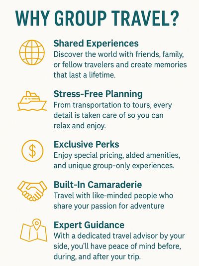 Ocean and river cruises designed for shared experiences. Enjoy exclusive group perks, pre-arranged excursions, and the camaraderie of traveling with fellow explorers.